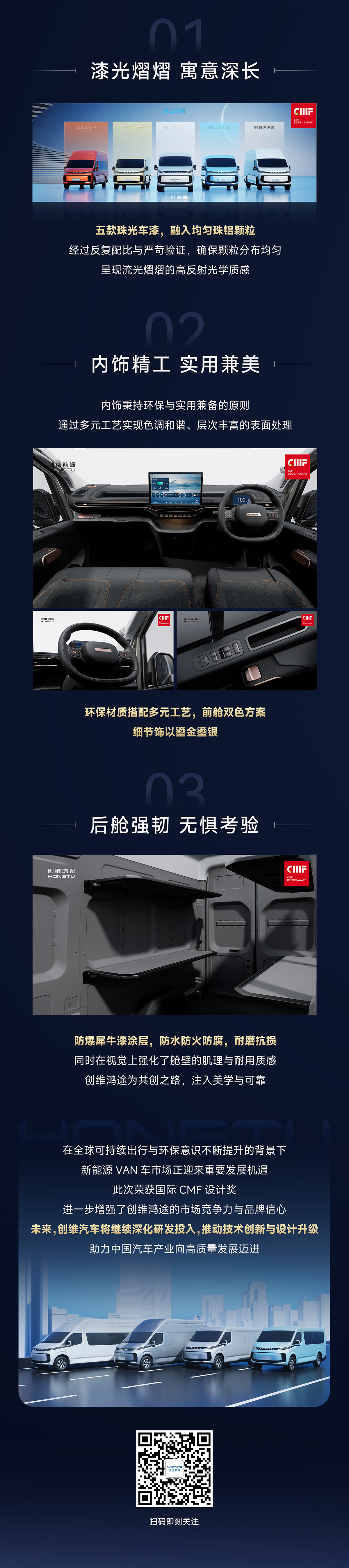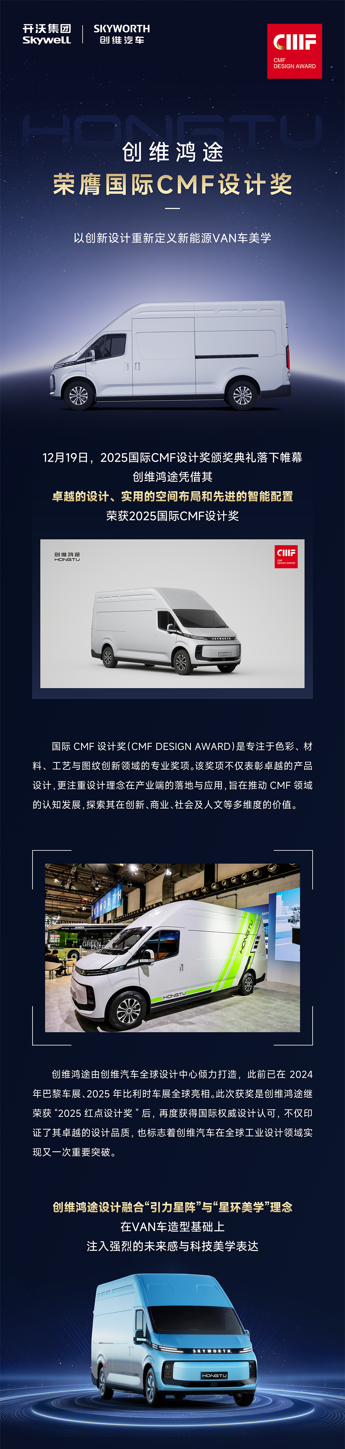在全球可持续出行与环保意识不断提升的背景下,新能源VAN车市场正迎来重要发展机遇。此次荣获国际CMF设计奖,进一步增强了创维鸿途的市场竞争力与品牌信心。未来,创维汽车将继续深化研发投入,推动技术创新与设计升级,助力中国汽车产业向高质量发展迈进。