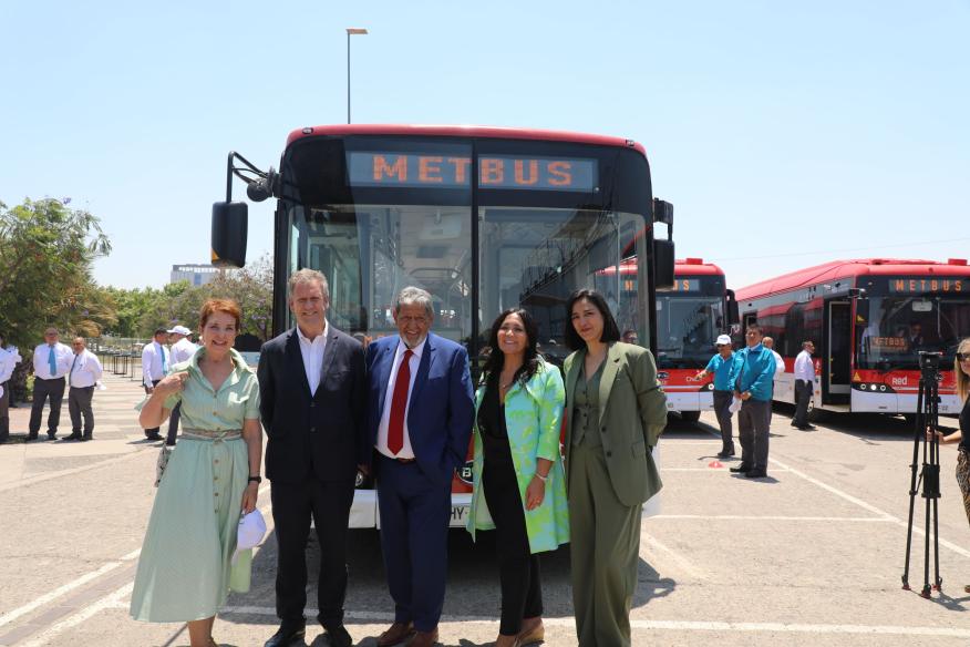 从左到右:智利前交通与电信部长 Gloria Hutt;交通与电信部长 Juan Carlos Muñoz;Metbus 总经理 Juan Pinto;大都会公共交通局局长 Paola Tapia;比亚迪智利国家经理 Tamara Berríos。