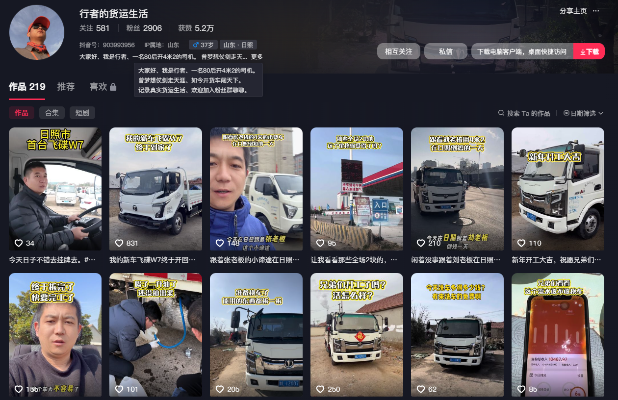 他在视频里分享用车心得、吐槽运输小烦恼、传递乐观心态,不少网友被他的积极打动。问及 “货运辛苦为何始终乐观”,他坦言:“辛苦是常态,但日子要笑着过。有靠谱的车、热爱的事、并肩的队友,就很知足。” 真实的分享,不仅让大众看见货运人的坚守与不易,更让飞碟汽车的产品实力,通过一线用户口碑直观展现。